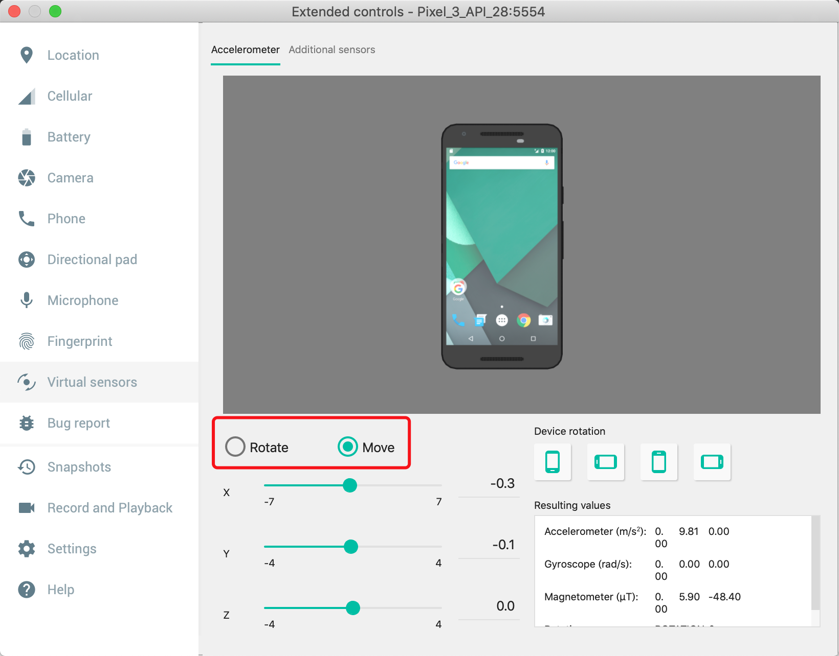 从模拟器右侧三个点进入模拟器设置页,并切换到Virtual sensors选择下图红框中的Move可以快速拖动X坐标,或者鼠标点击手机快速摇动,即可实现摇一摇的动作